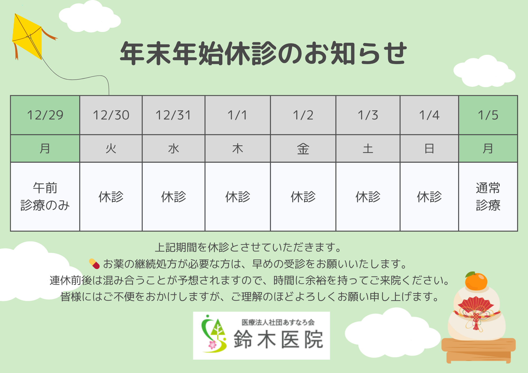 当院は年末年始につき、下記期間を休診といたします。